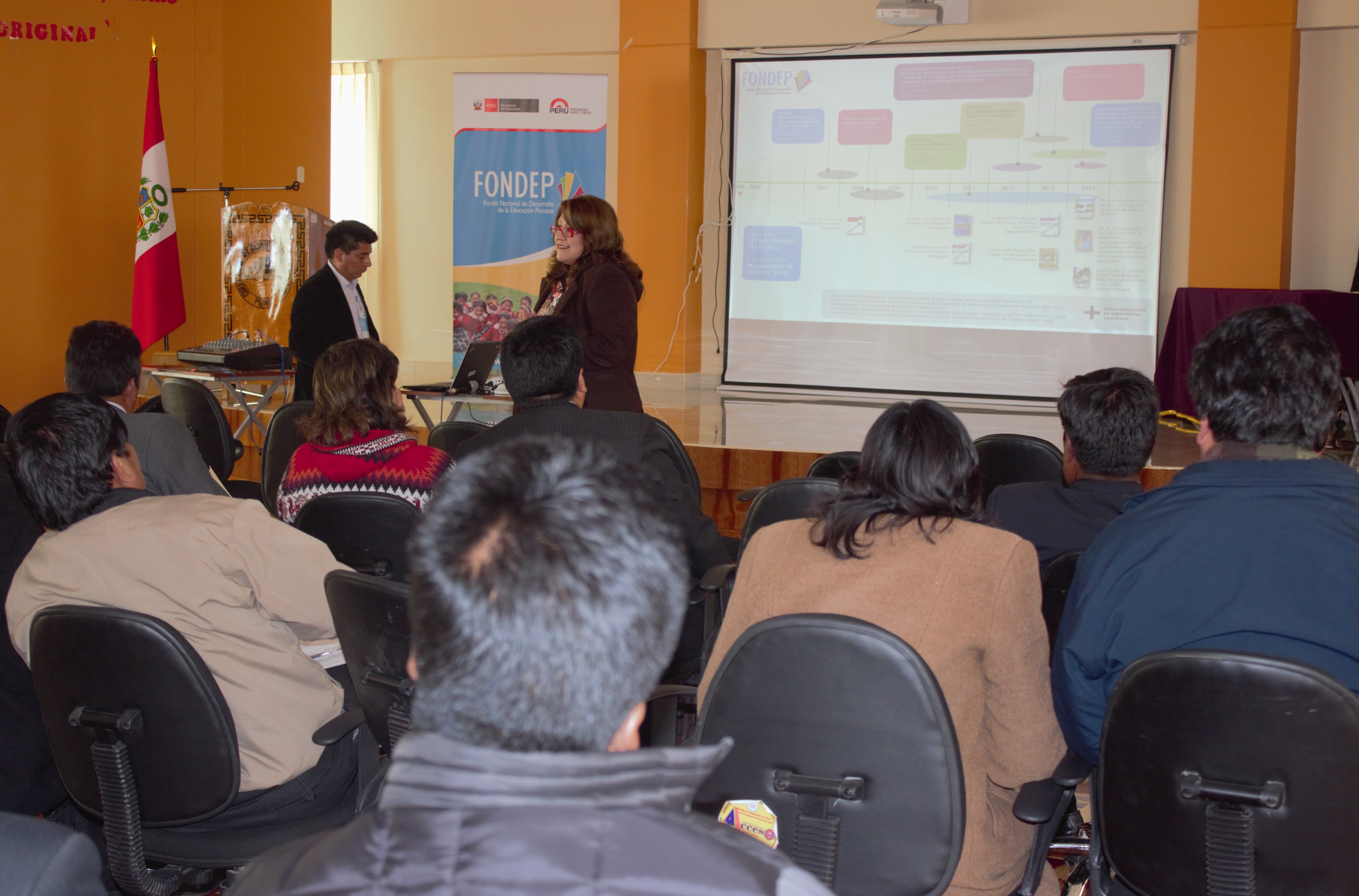 La jornada convocó a un aproximado de 40 especialistas de las diversas UGEL, dos representantes de cada provincia y se desarrolló en el marco de acuerdos firmados entre la DRE Puno y el FONDEP, quienes trabajan articuladamente para promover innovaciones educativas,