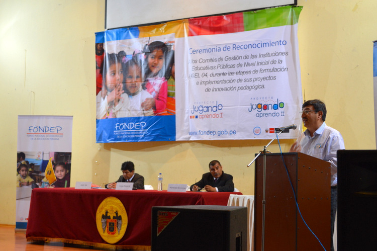 Durante la ceremonia Jorge Oroza Manrique, Gerente Ejecutivo del FONDEP, felicitó a las maestras asistentes por la apuesta que han hecho al participar del concurso del Proyecto Jugando Aprendo II, pues con ello están cambiando para mejor la educación de sus alumnos.