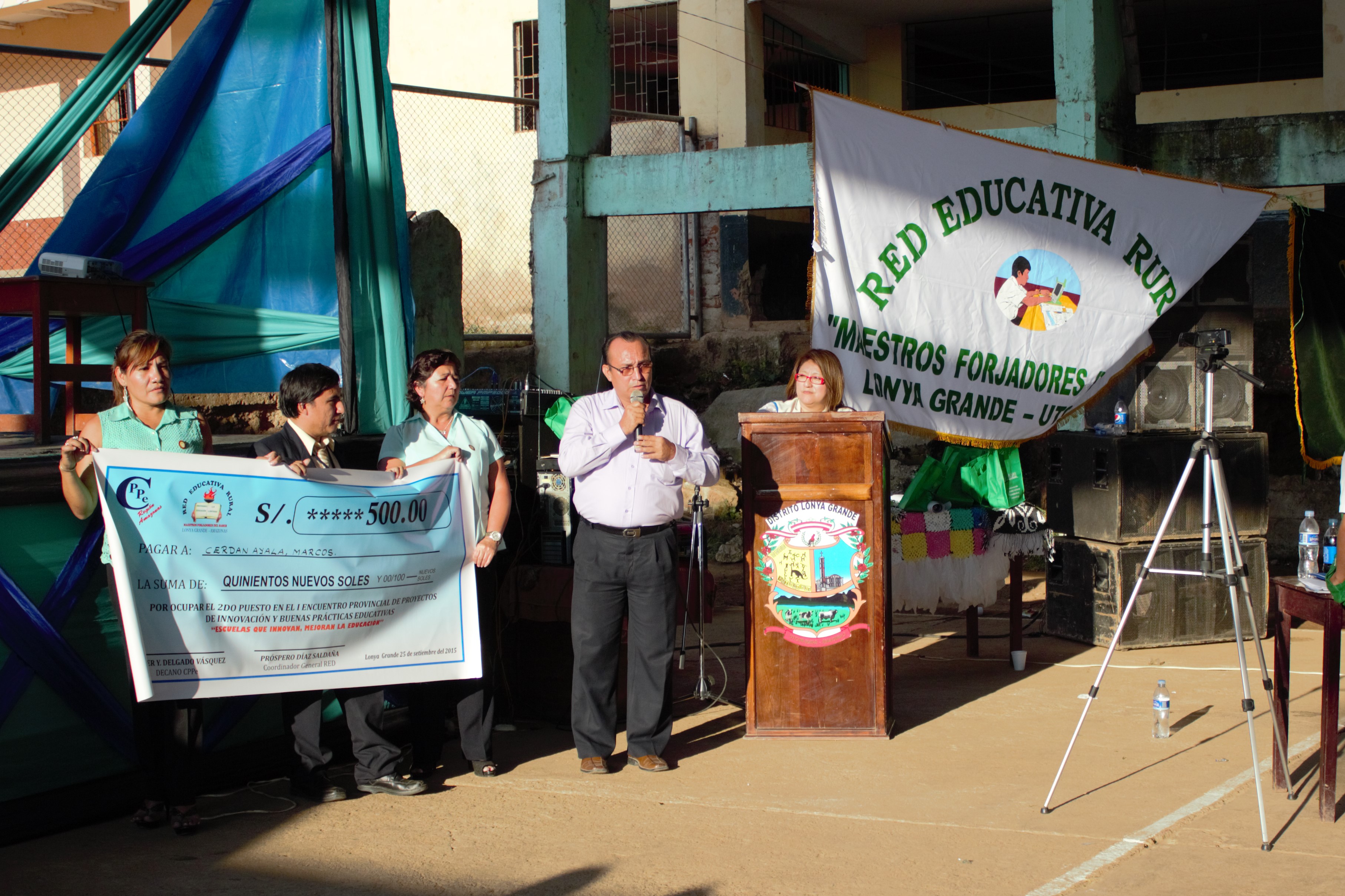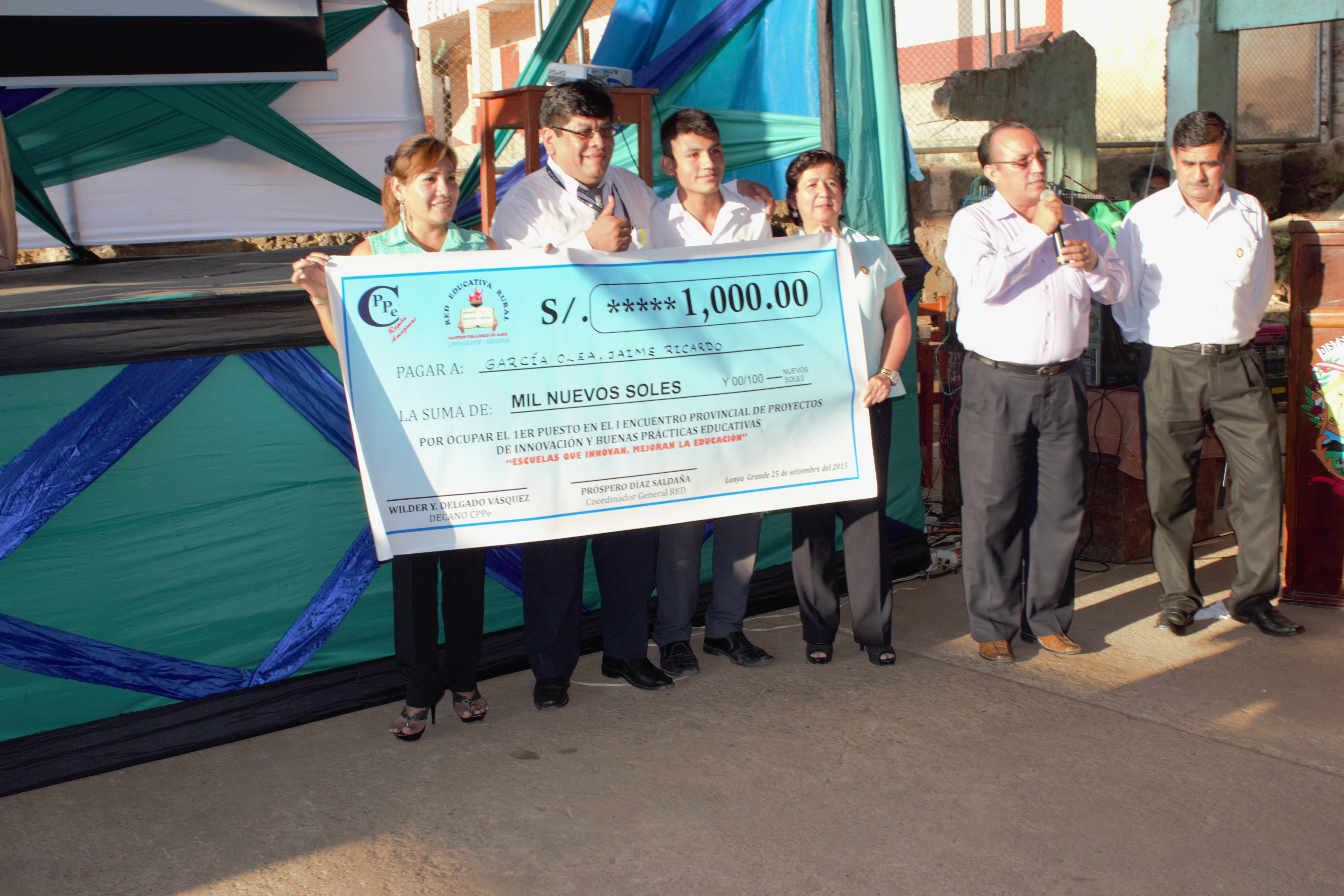 Los premios para el primer y segundo puesto fueron otorgados por el Colegio de Profesores de Amazonas consistente en mil nuevos soles para el primero y quinientos nuevos soles para el segundo puesto, para el tercer lugar se otorgó trecientos nuevos soles donado por la Cooperativa CECAFE Lonya Grande, y para el cuarto lugar una Tablet donada por el SUTEP Regional, además el primer puesto se llevó la “Copa del Triunfo Educativo”, donada por el alcalde Distrital de Lonya Grande Prof. Idelfonso Guevara Honores quien como educador propuso que dicha copa debe rotar por toda la provincia en mano de los ganadores del mejor proyecto en los próximos concursos.